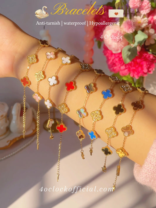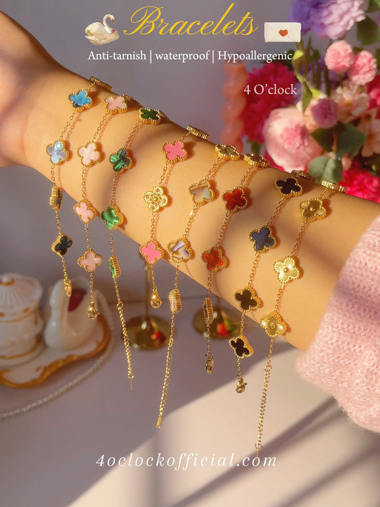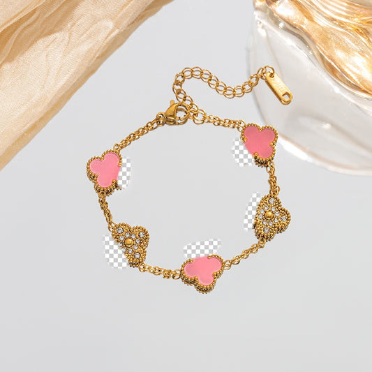 B84: 18k Gold Plated Stainless Steel Minimalist Bracelet: Golden Colorful Pink Clover