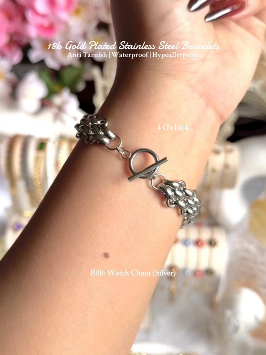 ⚜️B08: 18k Gold Plated Stainless Steel Minimalist Bracelet:Watch Chain (Silver)✨