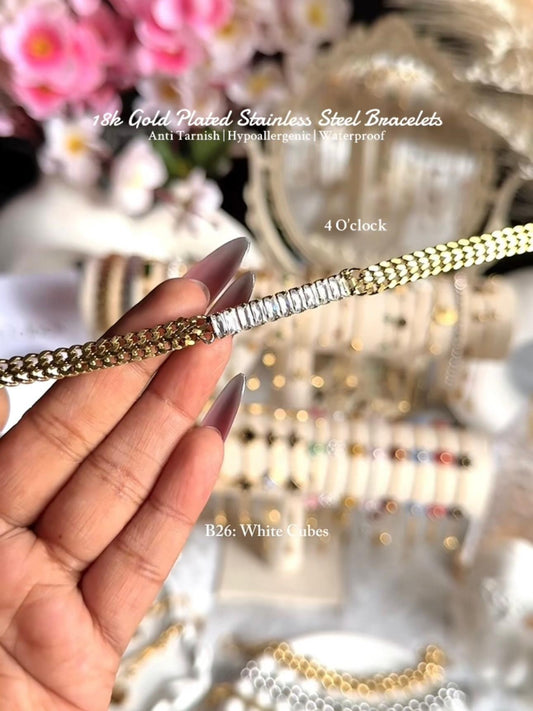⚜️B26: 18k Gold Plated Stainless Steel Minimalist Bracelet:White Cubes✨