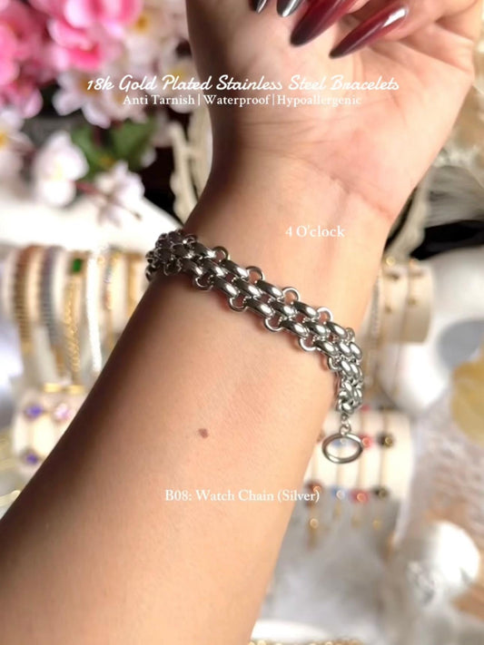 B08: 18k Gold Plated Stainless Steel Minimalist Bracelet:Watch Chain (Silver)