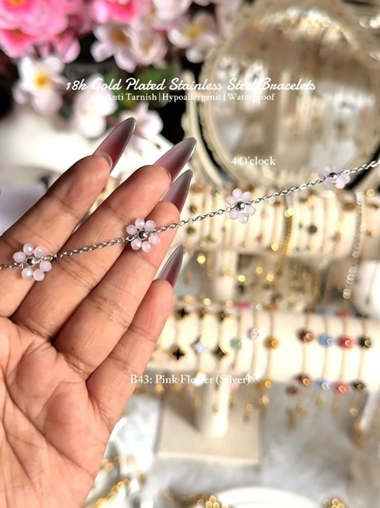 B43: 18k Gold Plated Stainless Steel Minimalist Bracelet:Pink Flower (Silver)
