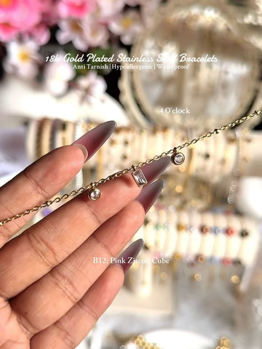 ⚜️B12: 18k Gold Plated Stainless Steel Minimalist Bracelet:Pink Zircon Cube✨