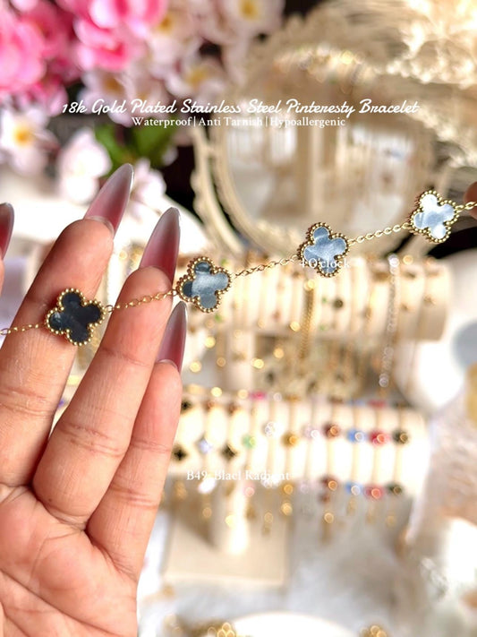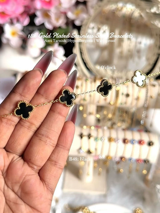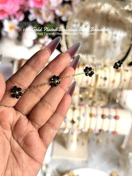 ⚜️B39: 18k Gold Plated Stainless Steel Minimalist Bracelet:Black Flower✨