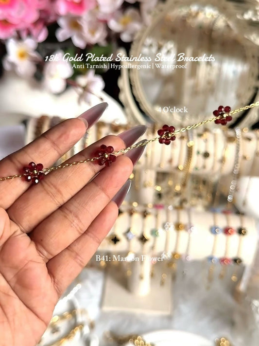 ⚜️B41: 18k Gold Plated Stainless Steel Minimalist Bracelet:Maroon Flower✨