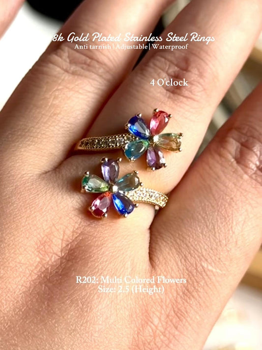 💍R203: 18k gold plated Stainless Steel Zircon Minimalistic Finger Ring: Multi Colored Flowers (With Box)✨